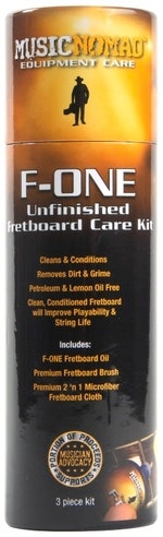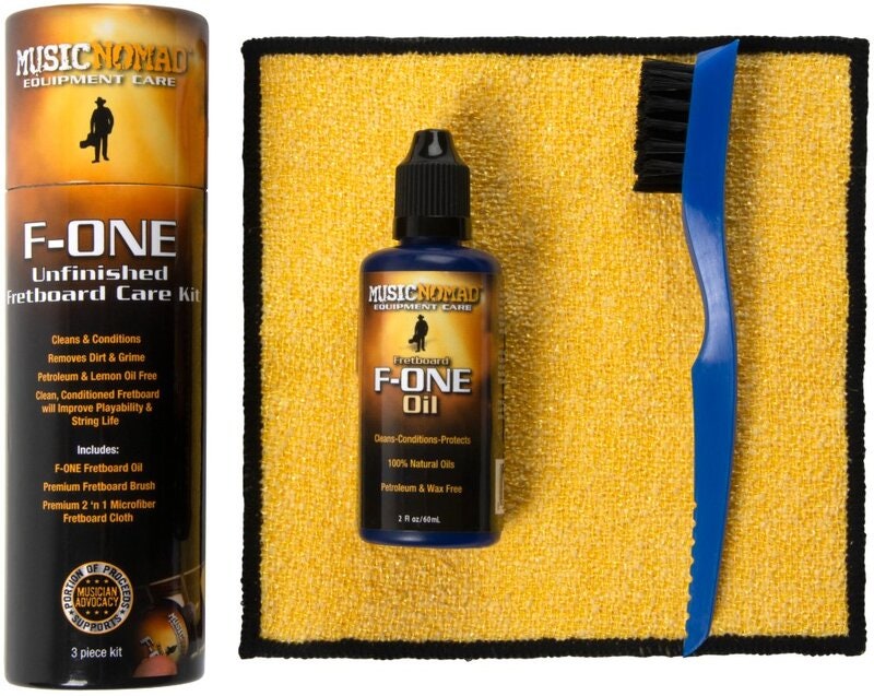 Et renset og fugtmættet gribebræt forbedrer ikke kun spilbarhed og strengenes levetid, men også det ubehandlede gribebræts sundhed ved at forhindre det i at tørre og revne. MusicNomads F-ONE Unfinished Fretboard Care Kit indeholder alt hvad du behøver for at rengøre og fugte dit ubehandlede gribebræt. F-ONE Oil er formuleret ved hjælp af en kompleks blanding af de fineste ultraraffinerede træ- og frøolier som renser, plejer og beskytter. Produktet indeholder ingen citronolieekstrakter, voks, petroleumsdestillater, silikone eller vand. Den innovative 2 'n 1 mikrofiberklud er tosidet. Den ene side er blød til skånsom påføring og rengøring med F-ONE, mens den anden side er designet med små skrubbere, der er vævet ind i stoffet så de trænger ind og løfter snavs ud af gribebrættet. Den specialdesignede gribebrætbørste er det perfekte værktøj til præcisionsrensning og vedligehold omkring båndene og dybere træporer. Med et "V-Cut" børstehårdesign og en ekstra plastskraber er du helt klar til at give dit gribebræt den totale spa-behandling, den fortjener. MusicNomad høæver barren inden for udstyrspleje.