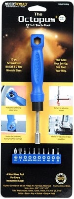 Forget lugging around screwdrivers, nut drivers, wrenches and Allen Keys or multiple bit sets in bulky cases, The Octopus 17 ‘n 1 Tech Tool can handle every job! MusicNomad’s patented, innovative design is the perfect tool for tightening or loosening screws and hex nuts on vital gear components like bridges, saddles, locking nuts, output jacks, control pots, tuning machine bushings and more. Just say no to metal....tools that is! Our ergonomic handle is made from strong ballistic nylon material that won’t scratch or ding your hardware and is engineered for the most popular Hex Wrench sizes : 10mm, 12mm, 14mm, 1/2” (2) & 7/16”. Our unique handle also holds the universal adapter giving you even more versatility. The metal universal adapter features a 7th 1/4” Hex Wrench for tightening or loosening hex nuts, in addition it securely holds our 10pc screwdriver bit set. Our screwdriver bit set features Phillips & flat head bits along with 8 Allen Key bits (.050", 1/16", 3/32", 1.5mm, 2.0mm, 2.5mm ,3.0mm, 4.0mm) for nearly any kind of screw you may find on your gear. It tackles every job including precision adjustments to pieces like tremolo systems. Take out the universal adapter to utilize our 1/2” narrow profile Hex Wrench for tightening tough to reach sunken pots & tele cups. This little tool delivers big results and is a must have for every instrument case.