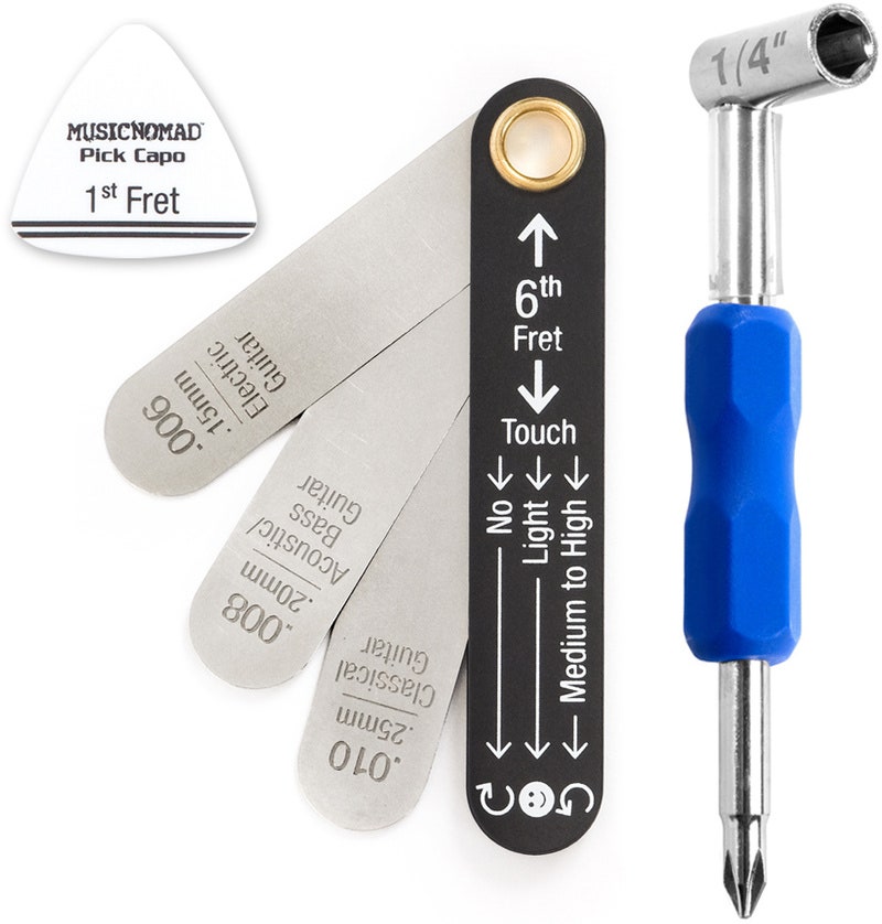 Being able to measure and adjust your TAYLOR® Guitar's neck relief is a critical step in the setup process and will improve your playability and sound. MusicNomad is making it real easy for anyone to perform this task with our Measure and Adjust kits. The Precision Truss Rod Gauge comes equipped with the 3 most common relief measurements for Electric, Acoustic, Classical and Bass Guitars (.006”, .008”, .010”). For TAYLOR®, use the .008" Gauge along with the clever Pick Capo and follow the instructions printed right on the gauge. When you are ready to adjust, MusicNomad's 1/4" Premium Truss Rod Wrench is made custom to fit the TAYLOR® Guitars truss rod nut that you adjust at the headstock. Equipped with a handy magnetic screwdriver on one end remove the tiny truss rod screws, and then turn it around and use the wrench to properly adjust your truss rod. Our ergonomic handle and rubber protective bumper gives you the comfort around your prized instrument. Keep your Gauge close by as it works on any Guitar or Bass and the 1/4" Wrench will work on other Guitar brands that require that size. Make sure you check out all MusicNomad's Precision Gauges and Tools used in the setup process. That's MusicNomad quality – raising the bar in equipment care.