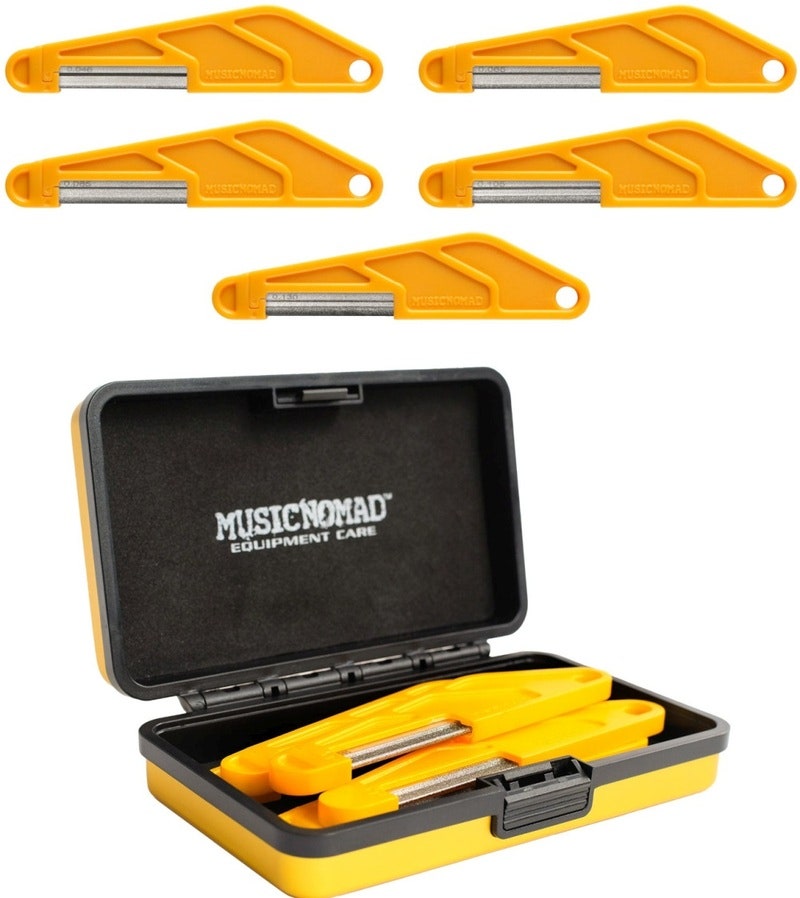 MusicNomad’s patent pending Nut Files feature a revolutionary diamond coating & round “string-shape” blade design resulting in smooth, precision cuts. They cut & polish slots at the same time & do not drift like common toothed files. The industrial, even diamond coating cuts & polishes all the most common nut materials such as nylon, bone, graphite & TUSQ. They even work amazing on saddles. We added an ergonomic handle for total comfort & control of your cut, or you can remove the blade from the handle as an alternative cutting option. This custom set comes with 5 Nut File sizes for Basses. We even include a compact, strong aluminum case. That’s MusicNomad quality – raising the bar in equipment care.