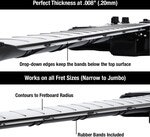 Med et fretshield fra MusicNomad kan du nemt og enkelt beskytte gribebrættet under rensning, slibning og nivellering af båndene. Slut med besværlig (og dyr) tape og i stedet pålidelig, simpel og elegant genbrugelig beskyttelse, lavet af slidstærkt, men ultratyndt stål (0.20 mm), der kan tåle 100-vis af arbejdsgange. Produktionsprocessen sikrer, at der ingen skarpe hjørner eller kanter er, så du kan stole på, at dit instrument ikke tager skade. Find den model, der passer til din guitar.