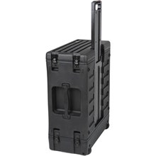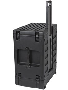 8U Roto Rolling Rack, incorporating an innovative new design that includes the one-touch pull handle and back lid mounted wheels for easy transport. Roto Rolling Racks will easily stack with our existing standard and shallow racks. Four military grade butterfly latches secure each lid with an internal rubber gasket that keeps water out so sensitive electronics stay safe and secure in transport.