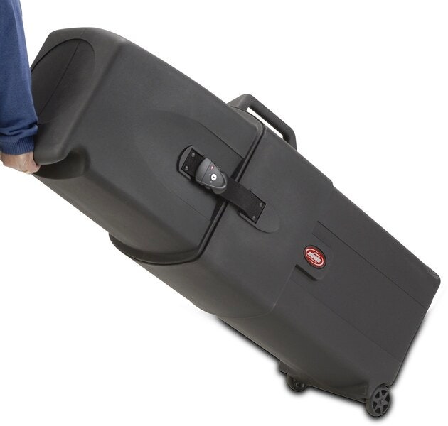 Robust stativ- & hardware-kasse med hjul. Modellen står på højkant med overdækkende låg. Ved udtagning findes en smart afsats til at holde foden imod, hvis det er lidt tungt, når kassen er fyldt.