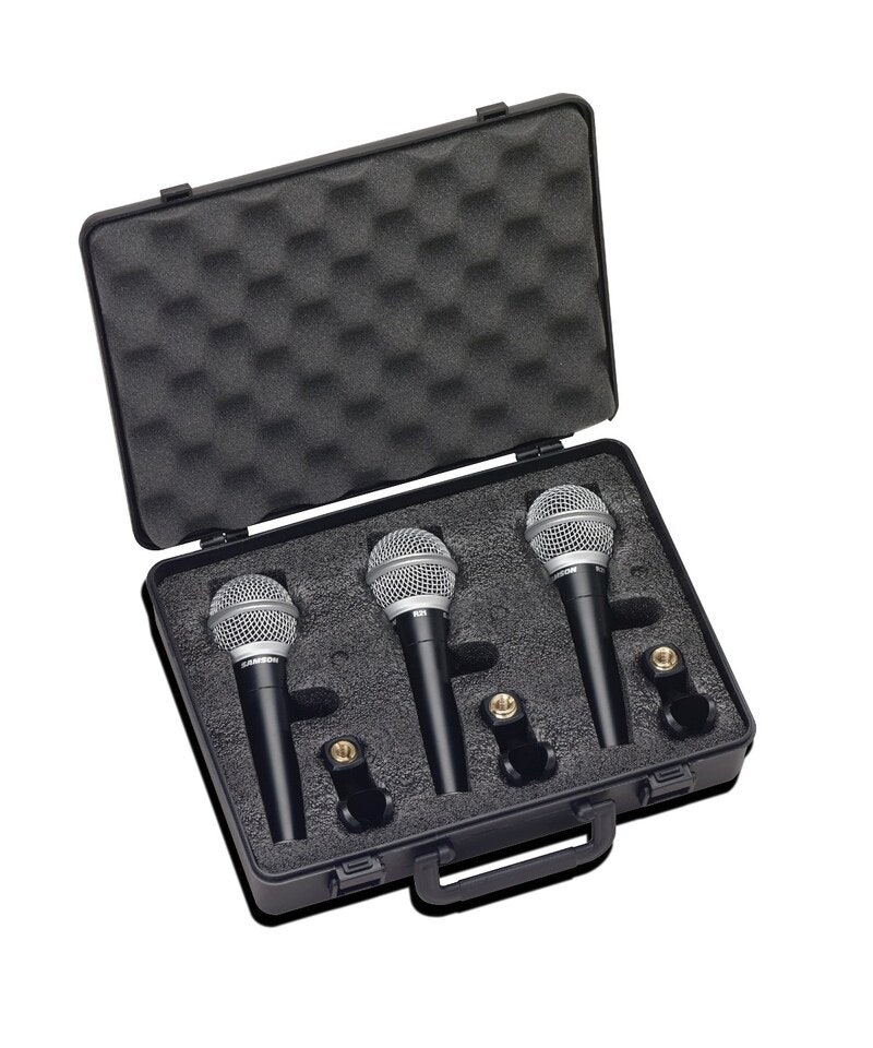 Dynamisk sang- og indspilningsmikrofon med on/off-omskifter, nyre karakteristik. 3-pakning, komplet med mikrofonholdere og taske.
