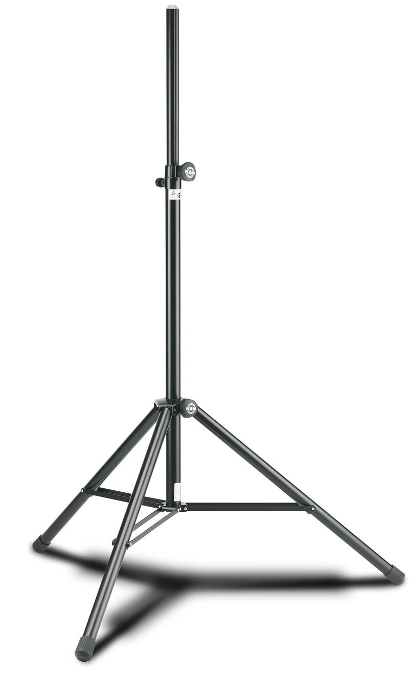 Sort højtalerstativ i aluminium med indbygget fjedersystem, som letter rigning af højtalere.