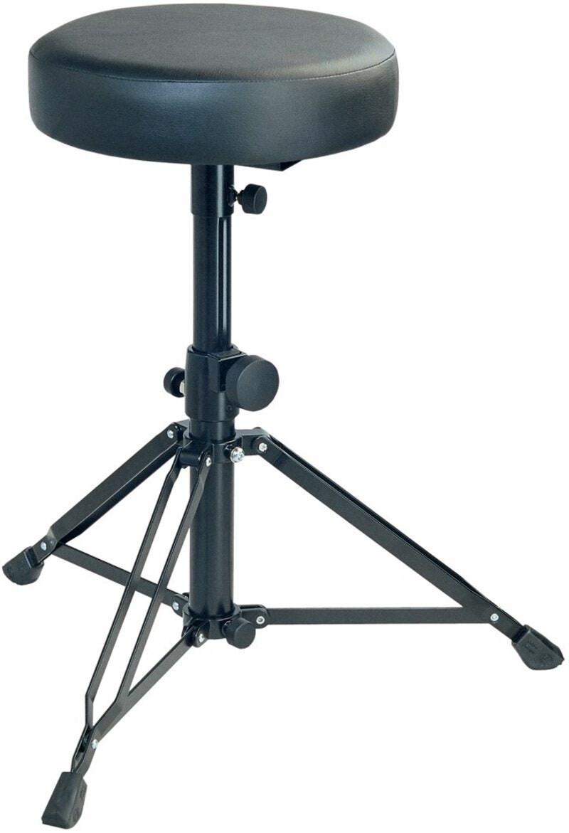 Rundt, polstret sæde med betræk af kunstlæder og sort stel med dobbeltben.