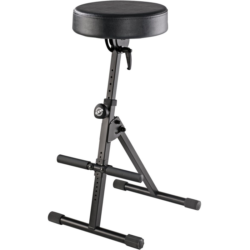 Performer-stol til scenebrug med integreret højdejusterbar fodstøtte, rundt sæde betrukket med kunstlæder og pneumatisk fjederhejs.