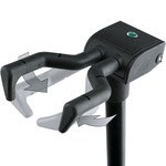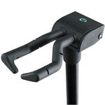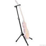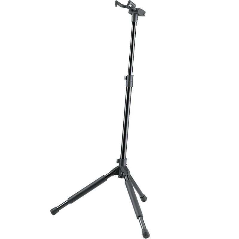 Sort guitarstativ med justerbar højde. Fleksibelt låsesystem til instrumentets hoved.