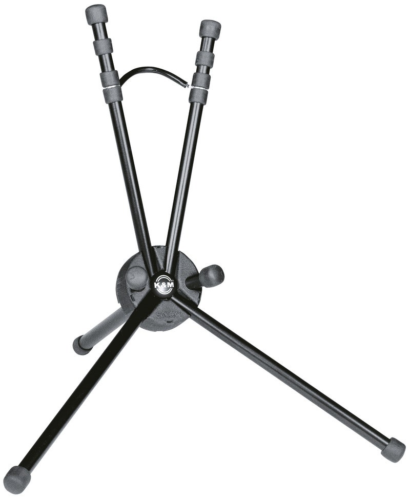Praktisk stativ til Eb altsaxofoner. Solide rør i aluminium med en central låsskrue. Gummibeslag beskytter instrumentet mod ridser. Klappet sammen er det meget kompakt og kan transporteres i medfølgende velourpose inde i saxofonens schalstykke.
