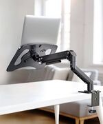 The customized solution for your workplace: this desk mount allows you to position your laptop in a space-saving and ergonomic way. The robust construction with integrated pneumatic spring can withstand loads of up to 9 kg. Thanks to the large, stable desk clamp (up to 60 mm wide), the entire mount can be quickly installed and used flexibly. Of course, the tray can be continuously tilted, rotated, and swiveled for a perfect viewing angle and a neck-friendly posture. In addition, the entire arm can be swiveled 360°. The integrated cable management also ensures a tidy and professional workplace.
