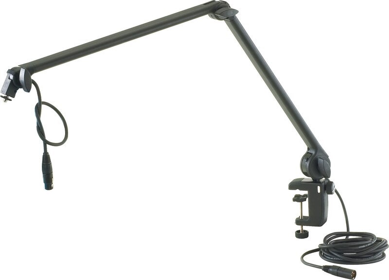 Eksklusiv vinklingsbar mikrofonarm med 3/8"-gevind og adapter til 5/8"-gevind. Et moderne design med skruefæste for bordmontering for hurtig og enkel indstilling. Det interne XLR-kabel er 6 m langt. Skruefæstet klarer op til 53 mm tykkelse, men mikrofonarmen kan også fæstes med K&M 23855 (medfølger ikke).