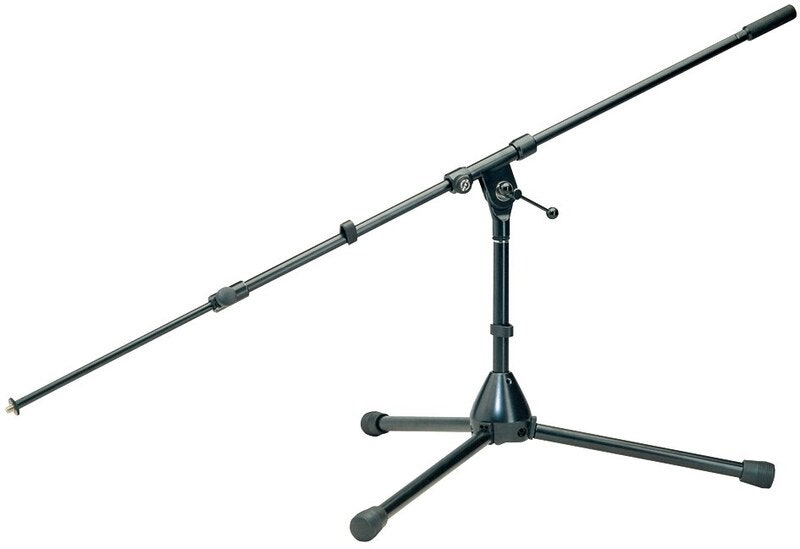 Lavt mikrofonstativ med foldbare ben og 2-delt lang boom.