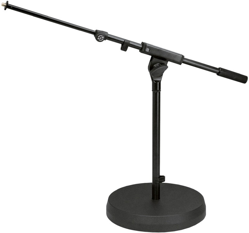 Artikelnummer 25525960Lavt mikrofonstativ med rund fod og 2-delt bom.