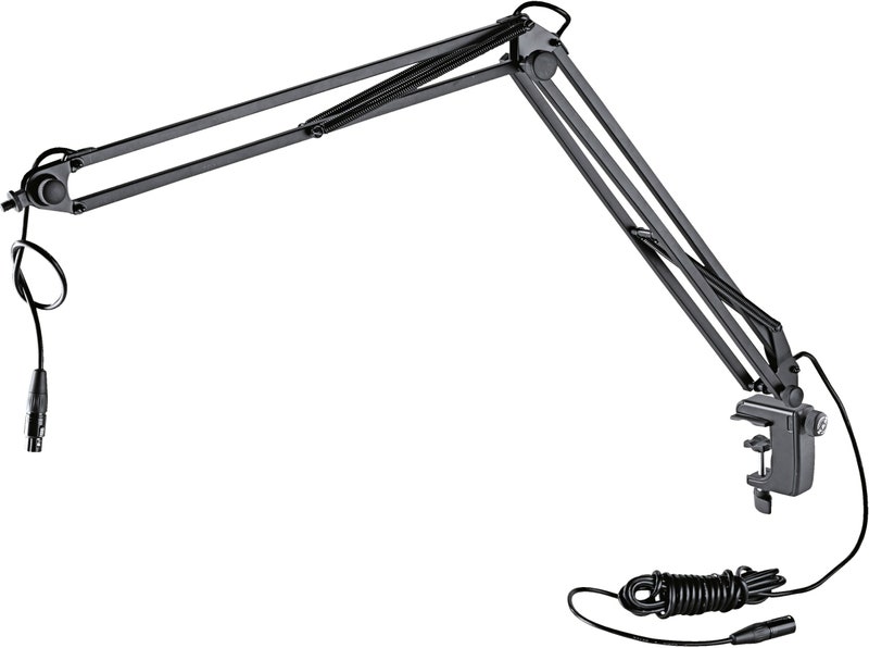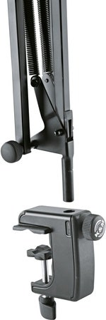 Todelt, bøjelig og vinklingsbar mikrofonbom med tvingfæste til bordmontering. Sort.