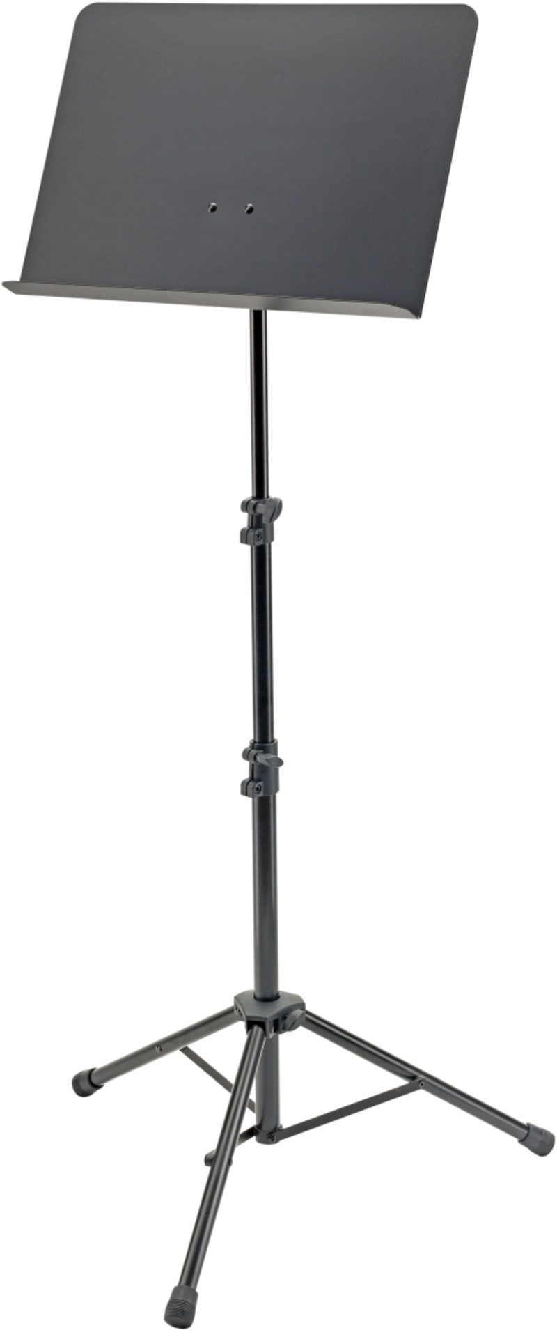 Powder coated aluminum music stand with a steel plate. Connecting parts made out of durable plastic. The music desk can be removed and attached easily with its user friendly and practical quick release mechanism. A large wing-nut makes it easy to adjust the angle. The music desk can be adjusted variably by clamping sleeves that protect the surface. 2 piece rod combination.