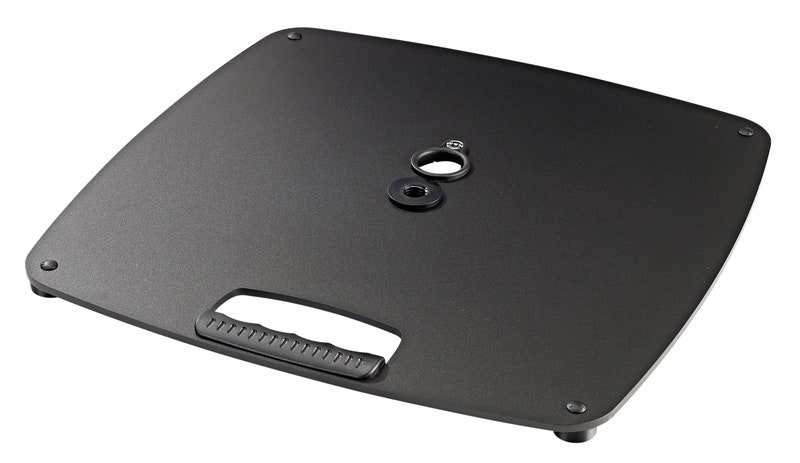 Afrundet kvadratisk fod med kraftige gummefødder, der passer til alle aftstandsrør og højttalerstativer med M20-gevind. Der er hul til kabelføring under pladen og integreret bærehåndtag.