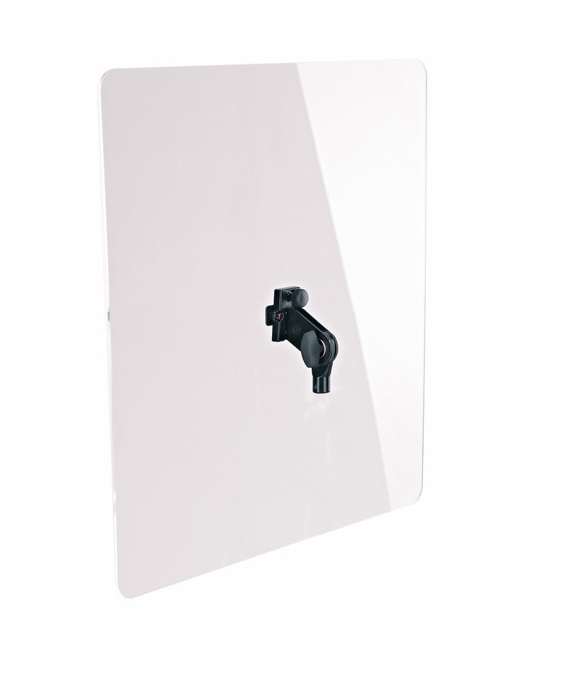 Flexible and mobile protective shield for increased protection against infection. In the music sector, the protective shield is suitable for use in orchestras and choirs. The infinitely adjustable swivel joint with its 3/8" threaded connection can be combined with any microphone stand in no time. The transparent acrylic glass plate has a size of 600 x 600 mm. Thanks to the proven König & Meyer prismatic connection, the plastic plate can be quickly and easily separated from the stand.