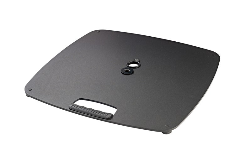 Afrundet kvadratisk fod med kraftige gummefødder, der passer til alle aftstandsrør og højttalerstativer med M20-gevind. Der er hul til kabelføring under pladen.