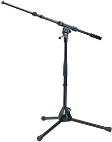 Lavt mikrofonstativ med 2-delt bom og korte, kraftige ben. Sort.