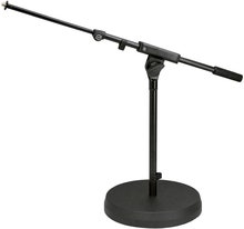 Lavt mikrofonstativ med rund fod og 2-delt bom.