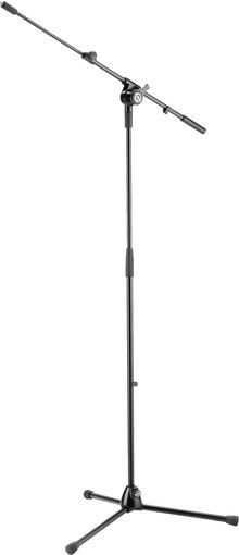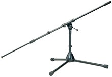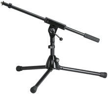 Lavt mikrofonstativ med sammenklappelige ben og bom. Sort.